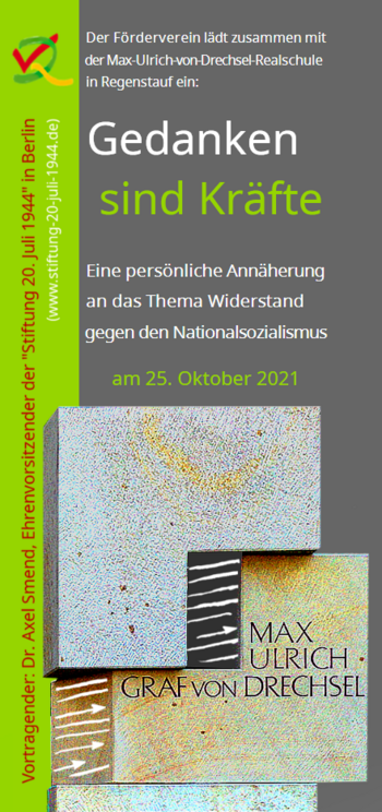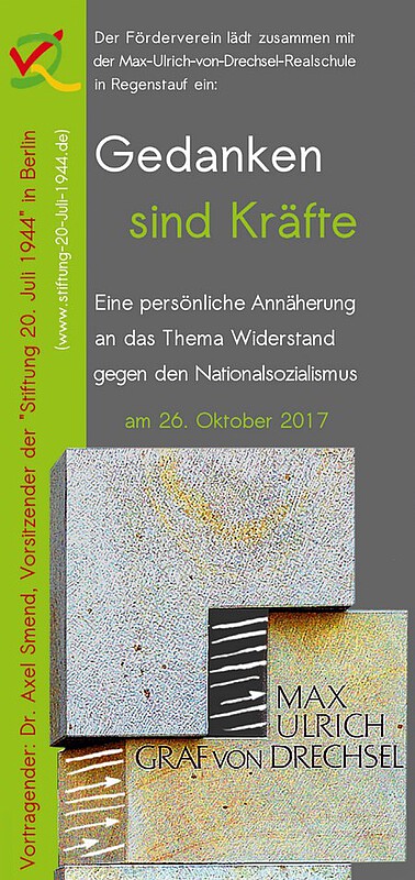 sehr herzlich laden wir Sie im Namen der Freunde der Max-Ulrich-von-Drechsel-Realschule zu einem Vortrag von Dr. Axel Smend am 26. Oktober 2017, 19.00 Uhr an der Max-Ulrich-von-Drechsel-Realschule, Hauzensteiner Str. 54, Regenstauf ein. Herr Dr. Smend ist Vorsitzender des Kuratoriums der Stiftung 20. Juli 1944.