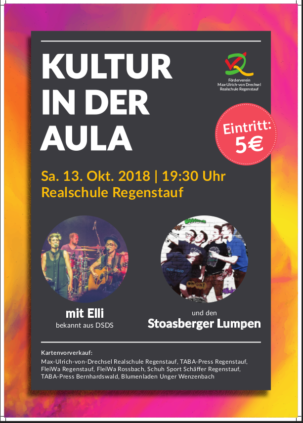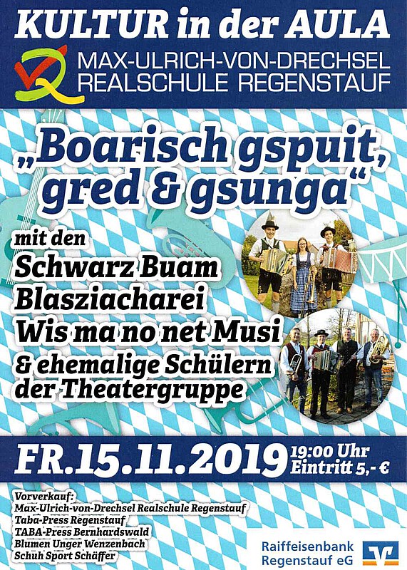 wir möchten kurz an die Veranstaltung „Kultur in der Aula: Bayerischer Abend – Boarisch gspuit, gred & gsunga“ am kommenden Freitag, den 15.11.2019 um 19:00 Uhr in der Aula der Realschule erinnern.